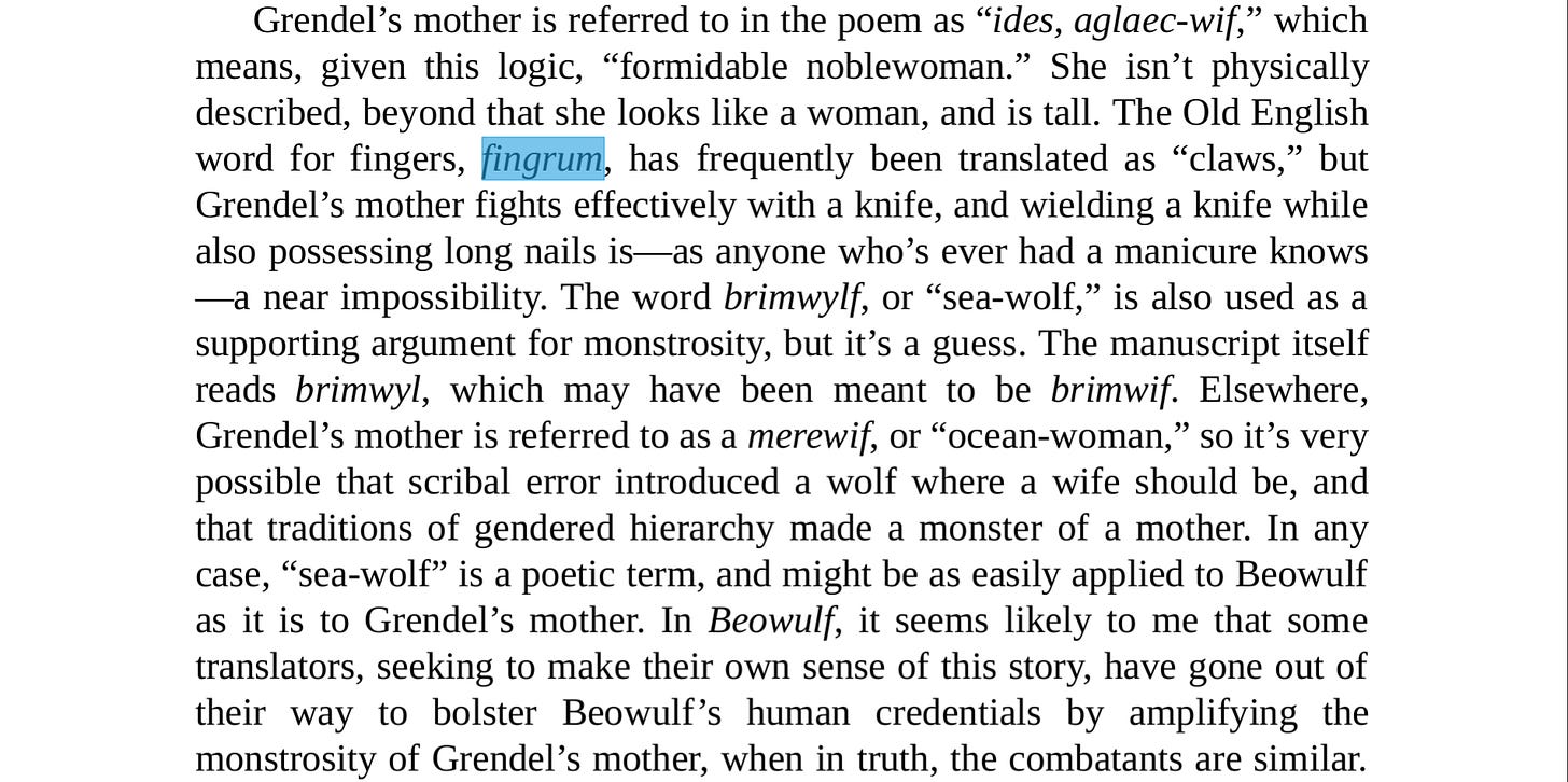 These quotations are from a paper by Sebo and Schilling (“Modthryth and the Problem of Peace-Weavers: Women and Political Power in Early Medieval England”, 2021) that is either inaccessible or steeply paywalled on all academic sites; but the style of argumentation is all too familiar to me from an early foray into feminist revisionism on Grendel’s mother. The modus operandi is to downplay or deny an obviously negative portrayal of a character by practicing a highly selective form of text-pedantry: seizing on some words, explaining away others, and all the while showing little respect for context and traditional referentiality (a.k.a. ‘limiting motifs’, ‘preconceptions’). This is how Christine Alfano was able to argue that a creature who lives at the bottom of a mere, gives birth to man-eating trolls, and takes sword-blows to the skull without damage was unjustly portrayed as a monster by conventional translators. Perhaps someone with an institutional subscription can let me know how Sebo and Schilling exonerate Thryth from the ‘awful crime’, ‘unqueenly behaviour’ and ‘false injury’ attributed to her by the Beowulf-poet.