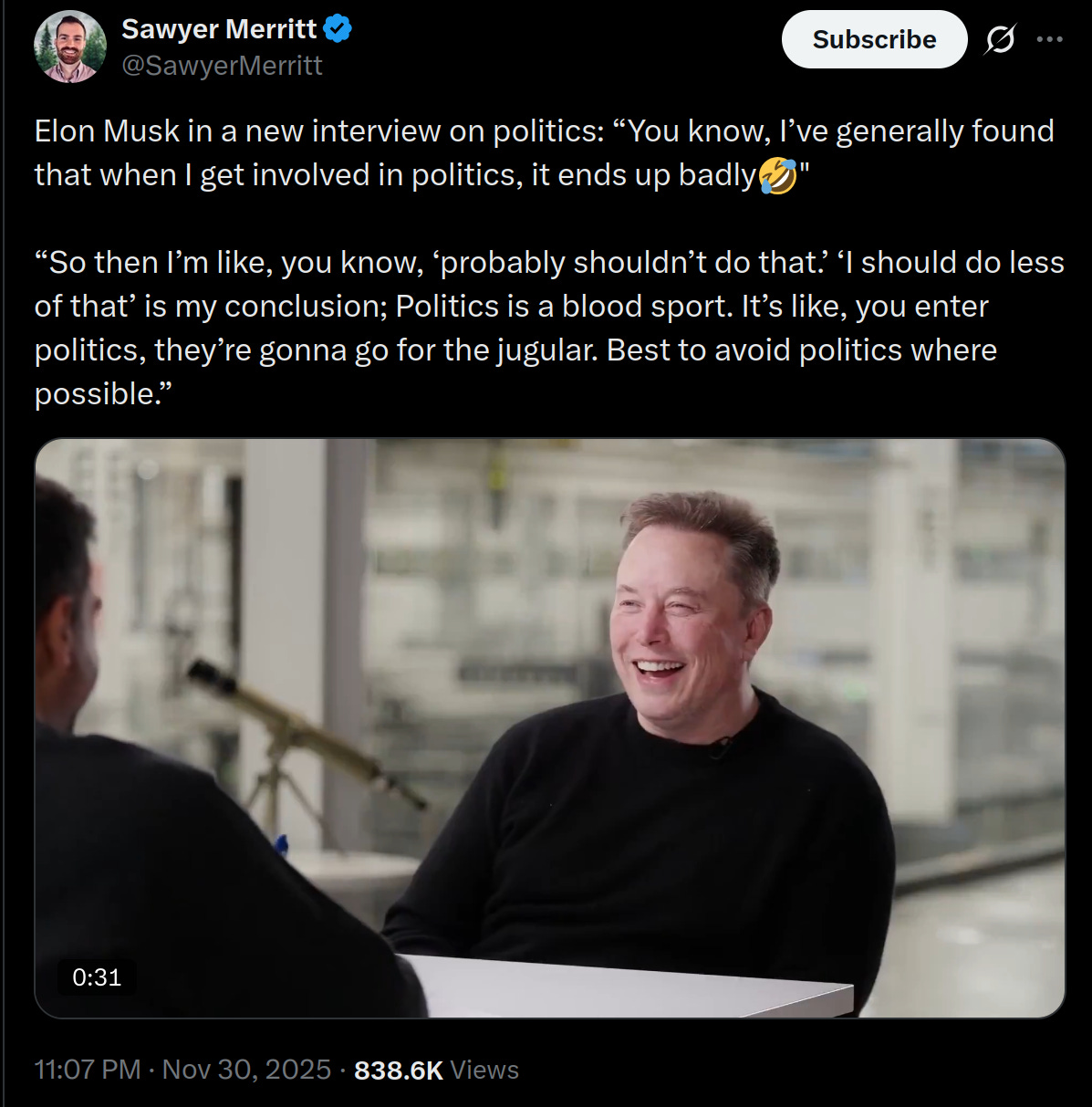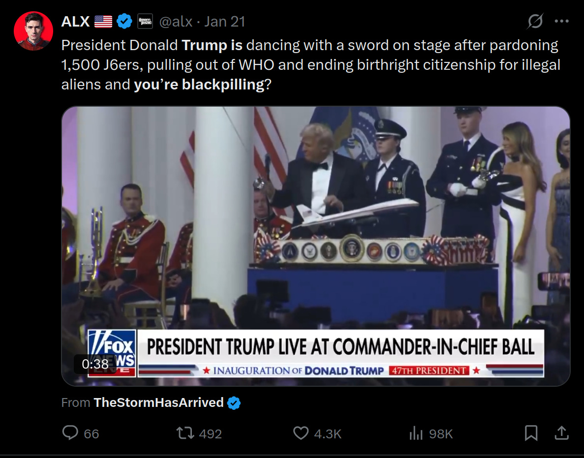 We don’t need hindsight to know that this was even more delirious, since the leftist political clerisy were and are still in charge of almost everything. But what hindsight does make clearer is that Trump never thought of himself as a military commander annihilating an implacable enemy; rather, he was trying to do what he said he was trying to do, to cut waste and stop fraud and make the permagov more responsive, efficient and economical. Can anyone really blame this arch-Boomer for not knowing what time it is, when the takeaway from a dissident right post on his streamlining efforts with hundreds of likes and approving comments is literally “we’re the regime now”? It’s hard to exert enough force to smash an enemy when both you and your most hardline supporters have acquired the nasty habit of identifying with it.