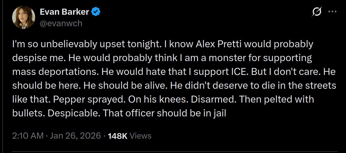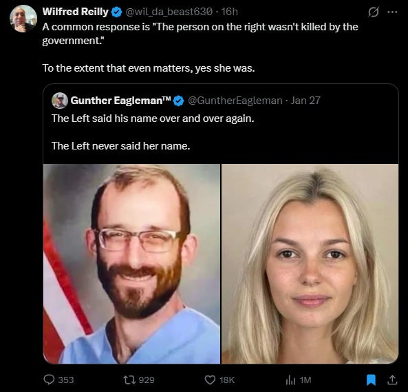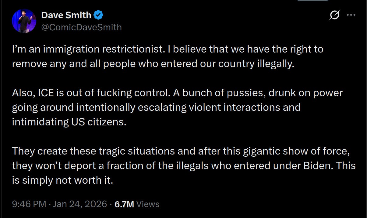 When living in China I was always told by locals never to give money to mutilated beggars, because it only encourages the sociopathic criminal gangs that are responsible for lopping their limbs off and sending them out to beg. Hearing Good’s lesbian partner express her shock that ICE had real bullets in their guns, then going on Xitter and finding leftists brazenly lying that they have no actual law enforcement powers, has given me quite the feeling of déjà vu on the question of whether to give political capital to martyred cop-baiters.