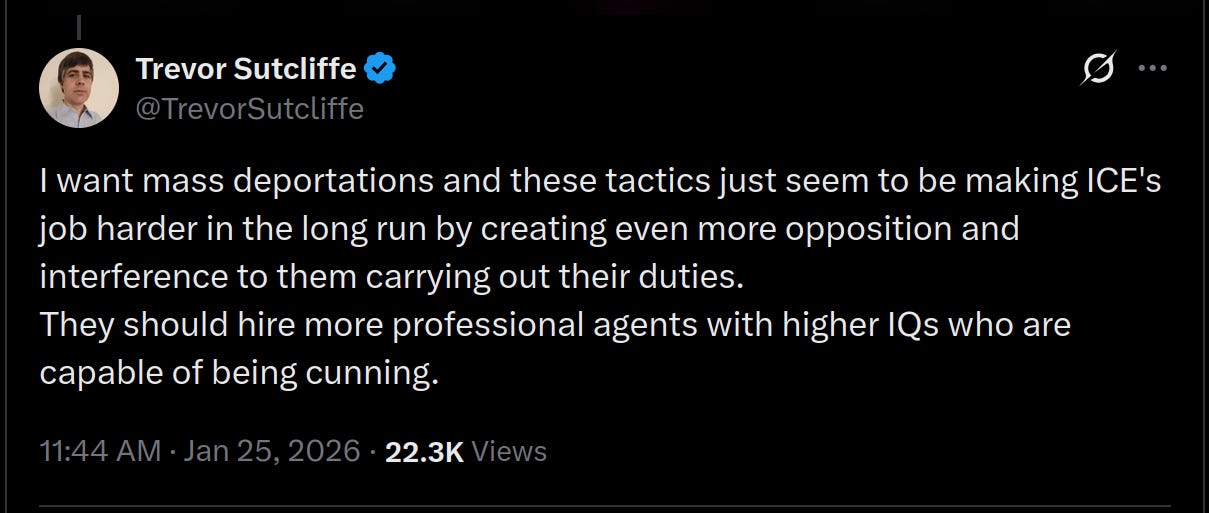 Let us start with a statement of the obvious: Minneapolis, home of St. Floyd, is a leftist open-air insane asylum located in a notoriously leftist state far up north on the US-Canadian border. One has to wonder why a huge surge of ICE agents was being deployed to deal with the relatively small numbers of illegal aliens there, while little was being done to restrict their widespread employment in Texas and other red states. And the answer would seem to be that Trump wanted to generate online videos of triggered libs rending their pussy hats over ICE raids (perhaps so that the White House Xitter account could set them to pop songs and convert them into AI slop memes), so as to fob off his schadenfreudy base without having to touch the thankless task of weaning pro-Republican big and small business off illegal labour.5
